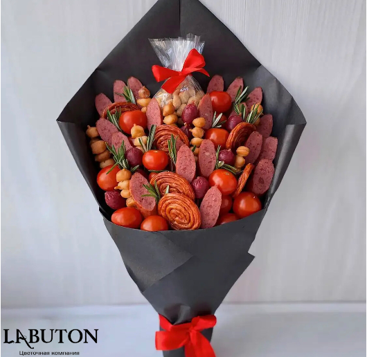 Достойному мужчине нужно дарить только достойные букеты. А выбор такого букета мы поможем вам сделать. Посмотрите, что в этот раз родила фантазия наших неугомонных флористов. Итак, вас ждёт колбаска, копченый сырок, орешки, свежие томаты и зелень. Заказать букет с колбасой для вашего мужчины с доставкой вы сможете всего в несколько кликов на нашем сайте.